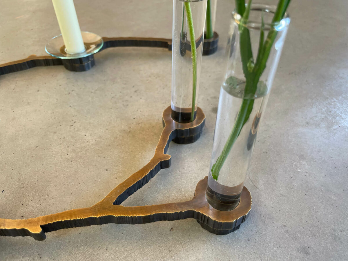 is a whimsical, interactive set of burnished, bronze steel branches that can create a boundless sculpture of individual candles and flowers, that expand far across tables and floors. The limitless options of assemblage give the beholder a sense of playful freedom and authority to create their own sculpture, no matter how small or large. By representing branches, it reflects on the relevance and value of our natural surroundings and bridges the gap between inside and outside spaces.